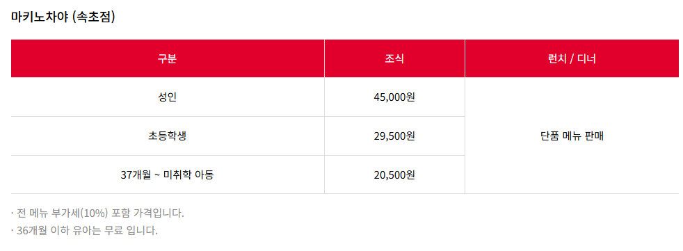 - 평일 디너 : 성인 72,000원, 초등학생 37,000원, 미취학 아동 20,000원