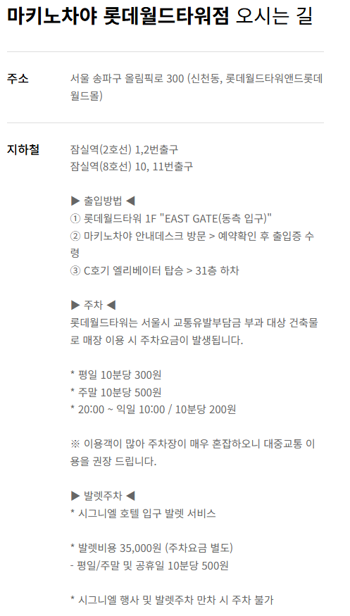 - 주소: 서울 송파구 올림픽로 300, 롯데월드타워 31층